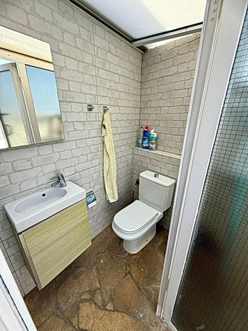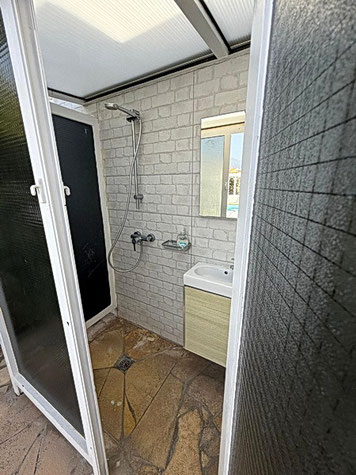 Am Ende vom Pool das Häuschen mit einem WC, Waschtisch und einer Dusche.
