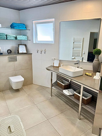 Geräumiges Bad mit modernem Hänge WC, großem Waschtisch, Heizung,
