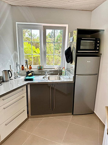 Moderne und neuwertige Küche, voll ausgestattet und außerdem ein Cerankochfeld, großer Kühlschrank mit extra Gefrierteil und einem Backofen.