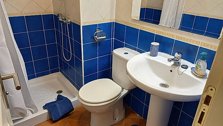 Das 2.Bad im Eingangsbereich mit einer Dusche und WC .