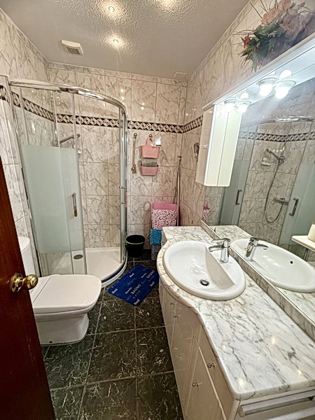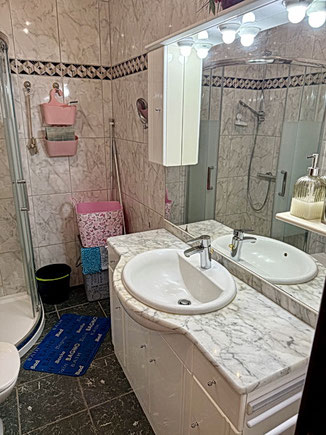 Das Badezimmer ist ausgestattet mit Waschtisch, Waschmaschine (top-Lader), WC und einer neu eingebauten, begehbaren Dusche.