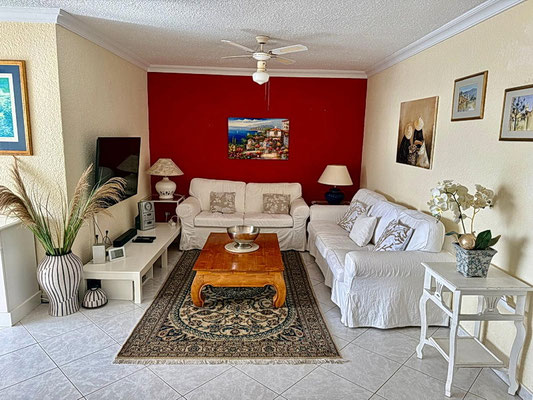 Nun kommen wir in den hübschen Wohnbereich mit einer Essecke mit Tisch und Stühlen, sowie der Fernsehecke.