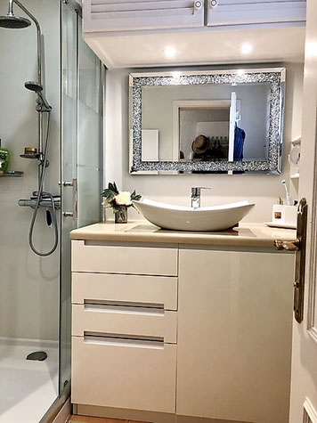 mit einem großen Spiegelschrank und einer maßangefertigten Kommode.