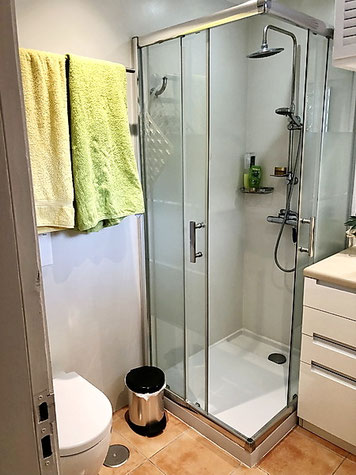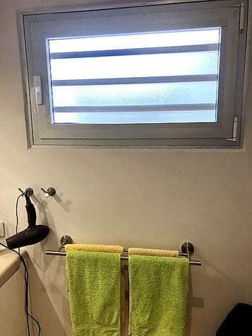 Das Bad mit einer begehbaren Dusche, WC, Fenster und Waschmaschine.